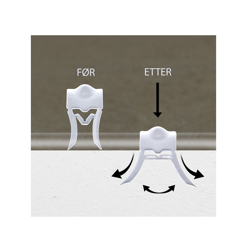Vår spesialutviklede og patentbeskyttede stift fungerer slik at når klammeret blir slått inn i underlaget vil stiftene bøye seg utover. Dette gjør at låsen mellom stiftene retter seg ut, og forankrer seg i gipsen, som gjør til at stiftene ikke løsner fra underlaget. Disse elementene i samarbeid gir Letti gipsklammer et uovertruffent godt feste.